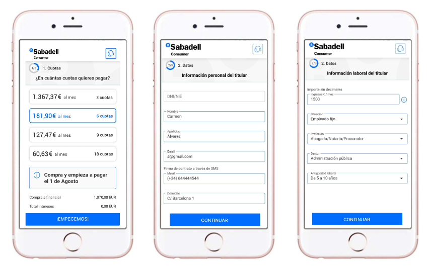 Quan reps l’enllaç que t’envia el Banc Sabadell Consumer, simplement has de seleccionar amb quantes quotes* vols fer el pagament (3, 6 o 9 mensualitats), hi has d’afegir les teves dades personals i sol·licitar el crèdit.